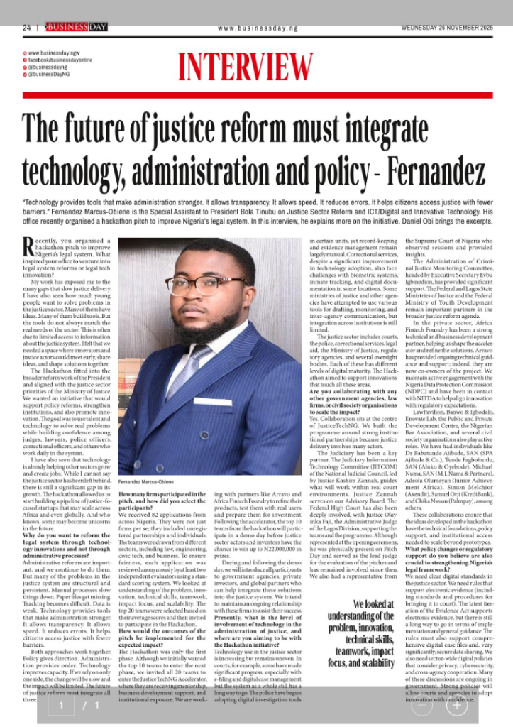 Today’s publication in BusinessDay felt like an important moment on this journey of justice reform. Speaking with Daniel Obi gave me space to explain why the future of our justice system must bring technology, administration, and policy into one stream of progress.